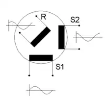 The primary winding of the transformer, fixed to the stator, is excited by a sinusoidal electric current, which by electromagnetic induction induces current in the rotor. As these windings are arranged on the axis of the resolver, the same current is induced no matter what its position. This current then flows through the other winding on the rotor, in turn inducing current in its secondary windings, the two-phase windings back on the stator. The two two-phase windings, fixed at right (90°) angles to each other on the stator, produce a sine and cosine feedback current. The relative magnitudes of the two-phase voltages are measured and used to determine the angle of the rotor relative to the stator. Upon one full revolution, the feedback signals repeat their waveforms. This device may also appear in non-brushless type, i.e., only consisting in two lamination stacks, rotor and stator.