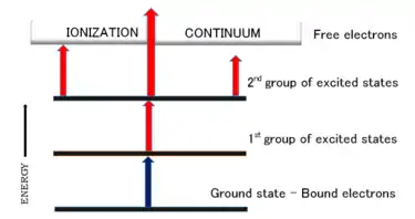 The routes were formed by the absorption of two or three photons to achieve excitation and ionization and are provided on the basis of optically possible transitions between atomic levels in a process called the bound-bound transition.[22] For an atom of the element to be promoted to a bound-continuum, the energies emitted from the photons must be within the energy range of the selected tunable lasers. Also, the ionization energy of the last emitted photon must exceed that of the atom.[23]