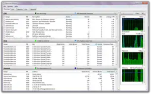 - displays column lists of Processes, Services, Associated Handles and Associated Modules; charts of CPU Usage (separate for every core)