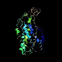 Like many other G protein-coupled receptors, the rhodopsin protein undergoes endocytosis following activation.[7][47][48] Perturbation of endocytic regulation of rhodopsin has deleterious effects on photoreceptor cell physiology. In certain mutants, rhodopsin and its regulatory protein arrestin form stable complexes. As mentioned these complexes have a fatal effect; when taken up during endocytosis these complexes causes photoreceptor cell death, because the internalized rhodopsin is not degraded in the lysosome but instead accumulates in the late endosomes. The formation of toxic Rhodopsin- Arrestin complexes is also reported for mutants of human rhodopsin associated with severe forms of ADRP.[7][49][50] For example, mutations at Arg135 are associated with severe forms of retinitis pigmentosa and exhibit a high affinity for arrestin, undergo endocytosis, and display endosomal abnormalities.[7]