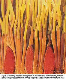 The initial retinal degenerative symptoms of retinitis pigmentosa are characterized by decreased night vision (nyctalopia) and the loss of the mid-peripheral visual field.[3] The rod photoreceptor cells, which are responsible for low-light vision and are orientated mainly in the retinal periphery, are the retinal processes affected first during non-syndromic (without other conditions) forms of this disease.[4] Visual decline progresses relatively quickly to the far peripheral field, eventually extending into the central visual field as tunnel vision increases. Visual acuity and color vision can become compromised due to accompanying loss of the cone photoreceptor cells, which are responsible for color vision, visual acuity, and sight in the central visual field.[4] The progression of disease occurs in both eyes in a similar but not identical pattern. A variety of indirect symptoms characterize retinitis pigmentosa along with the direct effects of the initial rod photoreceptor degeneration and later cone photoreceptor decline. Phenomena such as photophobia, which describes the event in which light is perceived as an intense glare, and photopsia, the presence of blinking, swirling or shimmering lights spontaneously occurring within the visual field, often manifest during the later stages of RP. Findings related to RP have often been characterized in the fundus (back layer) of the eye as the "ophthalmic triad". This includes the development of (1) a mottled appearance of the retina and retinal pigment epithelium (RPE) that gives the same visual appearance of Bone Spicule patterns (but are not Bone Spicules), (2) a waxy yellow appearance of the optic disk, and (3) the attenuation of blood vessels in size and Arterial/Venous ratio as they enter and exit the Optic Disk of the retina and transverse it.[3]