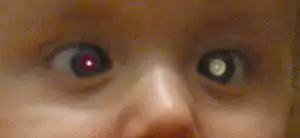The presence of the photographic fault red eye in only one eye and not in the other may be a sign of retinoblastoma. A clearer sign is "white eye" or "cat's eye" (leukocoria).[6]