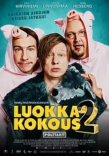 Reunion 2: The Bachelor Party (Finnish: Luokkakokous 2 – Polttarit) is a 2016 Finnish comedy film directed by Taneli Mustonen. It is sequel to the 2015 film Reunion. This time three friends, Antti, Niklas and Tuomas, end up in a new catastrophic adventure as Niklas and Antti try to arrange for Tuomas an all-time bachelor party while they are due to go to the funeral of their old classmate. Like the previous film, the sequel is starring by Sami Hedberg, Aku Hirviniemi and Jaajo Linnonmaa.