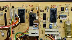 The deck's control functions are spread between three identical Philips MAB8440 microcontrollers,[12] clocked with a common 6 Mhz crystal.[45] Each microcontroller carries 4 kB of program memory and 128 bytes of random-access memory.[45] The first microcontroller polls the faceplate keyboard, infrared remote control port, and an optically decoupled RS-232 port; the second one controls the motors and calculates real-time tape counter values. The third microcontroller manages the digital-to-analog converters, CMOS switches, multiplexers and recording level meter; it executes the tape calibration program and stores current settings in non-volatile memory.[12] The EEPROM is updated at every transition to standby mode, or when the user presses a dedicated "store" button.[46][47] The microcontrollers, display and DAC drivers are connected with the I²C serial bus,[45] which was introduced by Philips in the early 1980s; according to Ludwig, a standardized bus was a prerequisite for a project of such size.[12]