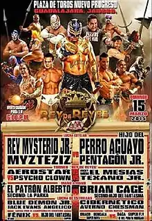 Rey de Reyes (Spanish for "King of Kings") was a professional wrestling pay-per-view (PPV) event produced by the Lucha Libre AAA World Wide (AAA) promotion, which took place on March 18, 2015, at the Auditorio Benito Juarez arena in Zapopan, Jalisco, Mexico. The show was the 19th event held under the Rey de Reyes name and also the 19th time that the eponymous Rey de Reyes tournament was held. The show was originally scheduled for Sunday March 15, 2015 but due to weather and problems with getting paperwork in order the show was postponed to March 18 instead. The main event marked the first time that Rey Mysterio Jr. wrestled after leaving WWE earlier in 2015. Rey Mysterio Jr. teamed up with Myzteziz to take on the tag team of El Hijo del Perro Aguayo and Pentagón Jr. in the main event of the show. Due to the dates moving the originally scheduled match between El Patrón Alberto and Brian Cage was canceled, replaced with a match between Blue Demon Jr. and Villano IV.