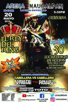 The Mexican professional wrestling company International Wrestling Revolution Group (IWRG; at times referred to as Grupo Internacional Revolución in Mexico) started their annual Rey del Ring ("King of the Ring") event in 2002, creating an annual event around the eponymous Rey del Ring match, a 30-man elimination match similar in concept to the WWE's Royal Rumble match.[2][3] From 2002 until the 2011 event the "prize" for winning the match itself was simply the prestige of outlasting 29 other competitors, but at the 2011 Rey del Ring IWRG introduced the IWR Rey del Ring Championship complete with a belt to symbolize the championship that would be awarded to the winner each year.[4] At that point in time the Rey del Ring title became a championship that could be defended and lost or won in matches in between the annual tournaments. For the tournament the champion would vacate the Rey del Ring Championship prior to the actual Rey del Ring match itself.[5] All Rey del Ring shows, as well as the majority of the IWRG shows in general are held in Arena Naucalpan, owned by the promoters of IWRG and their main arena. The 2018 Rey del Ring was the sixteenth over all Rey del Ring tournament held by IWRG.
