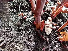 Common names for Japanese knotweed include fleeceflower, Himalayan fleece vine, billyweed, monkeyweed, monkey fungus, elephant ears, pea shooters, donkey rhubarb, American bamboo, and Mexican bamboo, among many others, depending on country and location.[2] In Japanese, the name is itadori (虎杖, イタドリ).[8] The kanji expression is from the Chinese meaning 'tiger stick'. One interpretation of the Japanese name is that it comes from 'remove pain' (alluding to its painkilling use),[9][10] though there are other etymological explanations offered.
