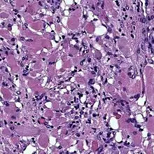 Cardiac rhabdomyomas are the most common primary tumor of the heart in infants and children. It has an association with tuberous sclerosis.[1] In those with tuberous sclerosis, the tumor may regress and disappear completely, or remain consistent in size. A common histological feature is the presence of Spider Cells, which are cardiac myocytes with enlarged glycogen vacuoles separated by eosinophilic strands, resembling the legs of a spider.