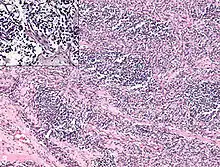 Rhabdomyosarcoma is often difficult to diagnose due to its similarities to other cancers and varying levels of differentiation. It is loosely classified as one of the small-blue-round-cell tumors due to its appearance on an H&E stain. Other cancers that share this classification include neuroblastoma, Ewing sarcoma, and lymphoma, and a diagnosis of RMS requires confident elimination of these morphologically similar diseases.[14] The defining diagnostic trait for RMS is confirmation of malignant skeletal muscle differentiation with myogenesis (presenting as a plump, pink cytoplasm) under light microscopy.[5] Cross striations may or may not be present. Accurate diagnosis is usually accomplished through immunohistochemical staining for muscle-specific proteins such as myogenin, muscle-specific actin, desmin, D-myosin, and myoD1.[25][34][35] Myogenin, in particular, has been shown to be highly specific to RMS,[36] although the diagnostic significance of each protein marker may vary depending on the type and location of the malignant cells. The alveolar type of RMS tends to have stronger muscle-specific protein staining. Electron microscopy may also aid in diagnosis, with the presence of actin and myosin or Z bands pointing to a positive diagnosis of RMS.[5][34] Classification into types and subtypes is accomplished through further analysis of cellular morphology (alveolar spacings, presence of cambium layer, aneuploidy, etc.) as well as genetic sequencing of tumor cells. Some genetic markers, such as the PAX3-FKHR fusion gene expression in alveolar RMS, can aid in diagnosis. Open biopsy is usually required to obtain sufficient tissue for accurate diagnosis. All findings must be considered in context, as no one trait is a definitive indicator for RMS.