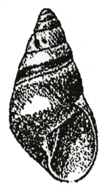 The shell of this species is oblong, ovate-conical, rather thick, slightly striated, glossy, in the upper part is pale, in the lower part it is black brown.[2] The shell has seven slightly curved and regularly increasing whorls.[2] The upper 3-4 whorls are blackish, the following are dim bluish.[2]