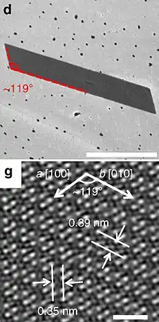 ![]() d: SEM micrograph of a typical parallelogram-shaped ReSe2 flake, scale bar 1 µm. g: top view of the ReSe2 atomic lattice | |