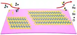 Rhenium diselenide with a thickness as small as a triple-atomic layer can be produced by chemical vapor deposition at ambient pressure. A mixture of Ar and hydrogen gases is flown through a tube whose ends are kept at different temperatures. The substrate and ReO3 powder are placed at the hot end which is heated to 750 °C, and selenium powder is located at the cold end which is kept at 250 °C.[4]