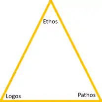 Aristotle established the classic triad of ethos, pathos and logos (the Aristotelian triad of appeals) that serves as the foundation of the rhetorical triangle.[7] The rhetorical triangle has evolved from its original, sophistic model into what rhetorician, Sharon Crowley, describes as the "postmodern" rhetorical triangle, the rhetorical tetrahedron.[8] The expanded rhetorical triangle now emphasizes context by integrating situational elements.
