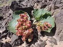 Rheum[2] is a genus of about 60 herbaceous perennial plants in the family Polygonaceae. Species are native to eastern Europe, southern and eastern temperate Asia, with a few reaching into northern tropical Asia. Rheum is cultivated in Europe and North America.[1] The genus includes the vegetable[3] rhubarb. The species have large somewhat triangular shaped leaves with long, fleshy petioles. The flowers are small, greenish-white to rose-red, and grouped in large compound leafy inflorescences. A number of cultivars of rhubarb have been domesticated both as medicinal plants and for human consumption. While the leaves are slightly toxic, the stalks are used in pies and other foods for their tart flavor.