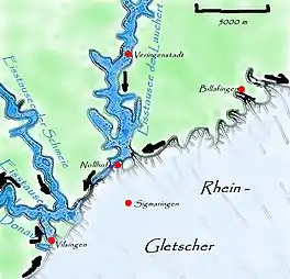 ![]() Reconstruction of the front of the Rhine glacier near Sigmaringen showing blockage the Danube course during the Riss glaciation. | |