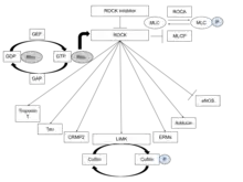Rho kinase inhibitors act on Rho kinase by altering the conformation of the protein, disrupting translocation to the plasma membrane, preventing ATP-dependent phosphorylation, and blocking RhoA binding to ROCK.[11] Some studies suggest that Rho kinase inhibitors also play a role in anti-angiogenesis by blocking ERK and Akt signaling pathways.[12][13] Rho kinase inhibitor also functions by blocking rho-mediated dephosphorylation of MLC20.[14]