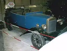 A Sports version was added in 1923 with a two-seater body with the spare wheel at the rear. The aluminium wings and bonnet were usually left unpainted. The engine was tuned with a high lift camshaft, special cylinder head and fully counterbalanced crankshaft. Options included an electric starter and a differential. A top speed of 65 mph (105 km/hour) and fuel consumption of 45–50 miles per gallon (6.2 to 5.6 L/100 km) was claimed.[3]