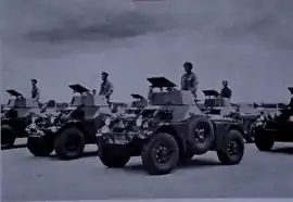 All squadrons could muster over 300 members for active duty. At one time, RhACR's ranks swelled to up to 500 troops in five squadrons, commanding 60 Eland armoured cars, 50 UR-416 personnel carriers, 20 Daimler Ferret scout cars, and a plethora of improvised fighting vehicles.[20] In 1979 an inventory of 8 Polish-built Soviet T-55LD tanks was also disclosed. It was leaked to the press that these had been captured from Mozambique during a cross-border raid, but they were in fact part of an impounded Libyan arms shipment destined for Uganda.[5] The tanks, diverted to Angola upon the fall of Idi Amin, were impounded by South African port authorities and subsequently donated to Rhodesia.[21] In the 1960s standard armour of the period was the Ferret, a pre-independence contribution from the British Forces Aden. Although 30 Ferrets had once been maintained by the Southern Rhodesian Armoured Regiment some of these were passed on to other successor states after the breakup of the Federation.[12] The Rhodesian Light Infantry only inherited 10 examples in varying states of disrepair and was forced to restore them.[3] Even older American T17E1 Staghounds of World War II vintage were also salvaged from a pending scrapyard.[22]