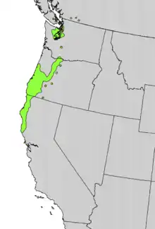 The northern limit of its range is somewhat north of the border between Canada and the United States in British Columbia. It is found as far south as Monterey Bay in California.[5] It is widely distributed in the Coast Mountains and Cascade Range. It is less abundant in the coastal mountains of Washington and northern Oregon and more common south of the Siuslaw River. It is mostly coastal in distribution but extends its range eastward to locations in the Cascade Mountains in Oregon, Washington and British Columbia.[5]