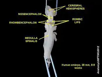 The rhombic lip is a posterior section of the developing metencephalon which can be recognized transiently within the vertebrate embryo. It extends posteriorly from the roof of the fourth ventricle to dorsal neuroepithelial cells.[1] The rhombic lip can be divided into eight structural units based on rhombomeres 1-8 (r1-r8), which can be recognized at early stages of hindbrain development.[2] Producing granule cells and five brainstem nuclei, the rhombic lip plays an important role in developing a complex cerebellar neural system.[3]