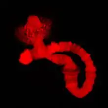 Rhynchosciara americana is a species of fly. It has a life cycle of approximately 70 days, and the sibling larvae show a synchronized development. The larvae can reach one inch in length, and the adult fly is about 0.8 inch (20 mm). The larvae groups are usually originated from the same female posture and spin a communal cocoon where the metamorphosis will occur. The fly is scientifically notable for the physiology of its polytene chromosomes and developmentally regulated amplified puffs, first observed by Crodowaldo Pavan.