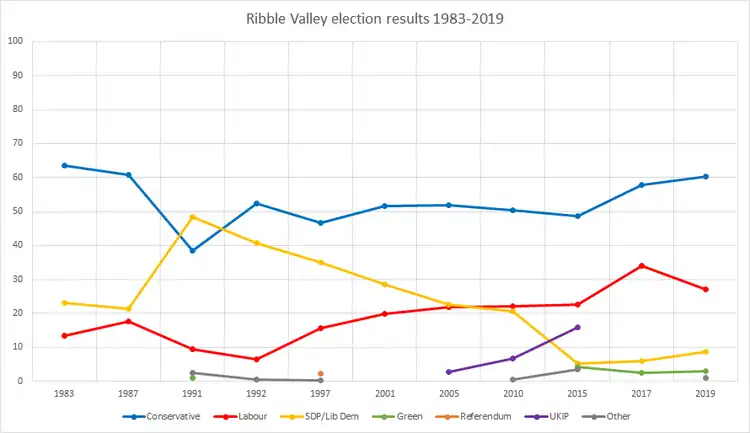 The constituency comprises the whole of the Borough of Ribble Valley and a part of the Borough of South Ribble. In March 2015, two councillors, a Liberal Democrat and an Independent, defected to the Conservatives. Since the May 2015 local elections the council has been composed of 35 Conservative, 4 Liberal Democrat and 1 Labour councillors.[7] 14 of the 19 South Ribble Borough councillors within the Ribble Valley constituency are Conservative, and 5 are Labour.