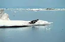 The ribbon seal lives in the Arctic parts of the Pacific Ocean. During winter and spring, it hauls out on pack ice to breed, molt, and give birth. During this time, it is found at the ice front in the Bering and Okhotsk Seas.[10] During the winter and spring, the ribbon seal lives in open water, though some move south as the ice recedes with warmer temperatures. Little is known about its habit during this time, as it is so far from land and human observation. The ribbon seal almost always comes to land.