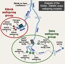 Ambiental value of a spring areal is important for local tourism too, and have a higher management value than hydromorphological one (although water quality makes it potable). Nearby arranged picnic areas exist with an open access, as well as the proximity to larger settlement Gornji Ribnik, where the newly built accommodation facilities is on offer, along with other natural and cultural values.[4][10] Around the source of the Ribnik, 4.5 km of trails are arranged for walking and outdoor recreation in the length of . The attractive nature and accessible river banks abound in preserved flora and fauna.[6] The close-by springs of the Sana river with three extremely strong individual karstic springs from which full-size river flow is formed, is located in the vicinity to the village of Donji Vrbljani, and complements whole area's ambiental value and touristic potential. The river Sana is also rich in salmonids.[6]