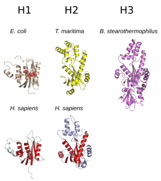 RNases H can be broadly divided into two subtypes, H1 and H2, which for historical reasons are given Arabic numeral designations in eukaryotes and Roman numeral designations in prokaryotes. Thus the Escherichia coli RNase HI is a homolog of the Homo sapiens RNase H1.[2][7] In E. coli and many other prokaryotes, the rnhA gene encodes HI and the rnhB gene encodes HII. A third related class, called HIII, occurs in a few bacteria and archaea; it is closely related to prokaryotic HII enzymes.[4]