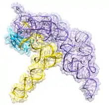 Ribonuclease P (EC 3.1.26.5, RNase P) is a type of ribonuclease which cleaves RNA. RNase P is unique from other RNases in that it is a ribozyme – a ribonucleic acid that acts as a catalyst in the same way that a protein-based enzyme would. Its function is to cleave off an extra, or precursor, sequence of RNA on tRNA molecules.[1] Further, RNase P is one of two known multiple turnover ribozymes in nature (the other being the ribosome), the discovery of which earned Sidney Altman and Thomas Cech the Nobel Prize in Chemistry in 1989: in the 1970s, Altman discovered the existence of precursor tRNA with flanking sequences and was the first to characterize RNase P and its activity in processing of the 5' leader sequence of precursor tRNA. Recent findings also reveal that RNase P has a new function.[2] It has been shown that human nuclear RNase P is required for the normal and efficient transcription of various small noncoding RNAs, such as tRNA, 5S rRNA, SRP RNA and U6 snRNA genes,[3] which are transcribed by RNA polymerase III, one of three major nuclear RNA polymerases in human cells.