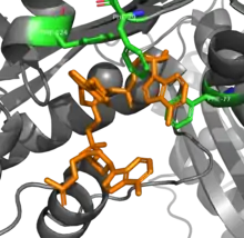 RNAse T is able to achieve its sequence specificity in RNA digestion via several aromatic residues that sandwich between nucleobases. The π-π interactions between four phenylalanine residues and the two nucleotides at the 3' end are different depending on the identify of the nucleotides, which changes the conformation and thus activity of the enzyme.[8] An additional glutamic acid residue rotates to hydrogen bond to cytosine by not other bases, further increasing specificity.[9]