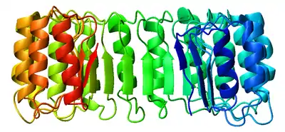 Ribonuclease inhibitor (RI) is a large (~450 residues, ~49 kDa), acidic (pI ~4.7), leucine-rich repeat protein that forms extremely tight complexes with certain ribonucleases. It is a major cellular protein, comprising ~0.1% of all cellular protein by weight, and appears to play an important role in regulating the lifetime of RNA.[2]