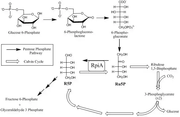 Ribose-5-phosphate isomerase (Rpi) encoded by the RPIA gene is an enzyme that catalyzes the conversion between ribose-5-phosphate (R5P) and ribulose-5-phosphate (Ru5P). It is a member of a larger class of isomerases which catalyze the interconversion of chemical isomers (in this case structural isomers of pentose). It plays a vital role in biochemical metabolism in both the pentose phosphate pathway and the Calvin cycle. The systematic name of this enzyme class is D-ribose-5-phosphate aldose-ketose-isomerase.
