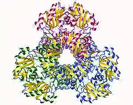 Crystallization and X-ray diffraction studies elucidated the structure of the enzyme, which was isolated by cloning, protein expression, and purification techniques. One subunit of ribose-phosphate diphosphokinase consists of 318 amino acids; the active enzyme complex consists of three homodimers (or six subunits, a hexamer). The structure of one subunit is a five-stranded parallel beta sheet (the central core) surrounded by four alpha helices at the N-terminal domain and five alpha helices at the C-terminal domain, with two short anti-parallel beta-sheets extending from the core.[2] The catalytic site of the enzyme binds ATP and ribose 5-phosphate. The flexible loop (Phe92–Ser108), pyrophosphate binding loop (Asp171–Gly174), and flag region (Val30–Ile44 from an adjacent subunit) comprise the ATP binding site, located at the interface between two domains of one subunit. The flexible loop is so named because of its large variability in conformation.[6] The ribose 5-phosphate binding site consists of residues Asp220–Thr228, located in the C-terminal domain of one subunit.[2][6] The allosteric site, which binds ADP, consists of amino acid residues from three subunits.[2]