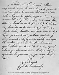 While bishop Casanova y Estrada was exiled in Costa Rica, he expressed a very high regard about the Exposición Centroamericana which general José María Reina Barrios, was organizing at the time. In a pastoral message sent from San José, on 29 June 1896 Casanova y Estrada pointed out that the Expo would allow the government to reach to great goals: that Central American get to know among themselves much better and that the area products would be showcased to the rest of the world.[6] After almost 10 years in exile, and coinciding with the 75th Central America Independence anniversary, Casanova y Estrada.[7] Upon learnings about this, president Reina Barrios -who happened to be a high ranked Mason — realized the bishop's patriotism and presented an initiative to the National Assembly on its inaugural session of 1 March 1897 to allow his return to Guatemalan soil. On 13 March, Decree 351, allowing archbishop Casanova y Estrada to return to Guatemala, was approved.[7]