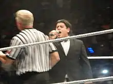 At the 2011 WWE Draft, Rodriguez and Del Rio were drafted to the Raw brand; the duo clashed with Big Show when Rodriguez ran over Big Show's leg by using Del Rio's car.[20] On June 6, Rodriguez masqueraded as Big Show as Del Rio mocked Big Show.[21] On his return to Raw on June 13, Big Show attacked Del Rio. Rodriguez came to his employee's aid and he was brutally attacked which caused him to take time off for an injury.[22][23] Rodriguez returned on July 18, 2011[24] On August 30 episode of SmackDown, when John Cena called out Del Rio, Rodriguez walked out alone to reply to Cena. Rodriguez spoke in a mixture of English and Spanish, explaining that Del Rio was not present. Cena then asked Rodriguez to deliver a message to Del Rio, and then promptly punched Rodriguez in the face.[25] On the September 12 episode of Raw, Rodriguez wrestled his first match for the brand, teaming with Del Rio to lose to John Cena and Bret Hart.[26]