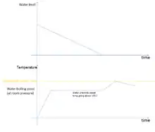 The bowl is filled with rice and water and heated at full power; the water reaches and stays at boiling point (100 °C, 212 °F).[1] When the water has all been absorbed, the temperature can rise above boiling point, which trips the thermostat. Some cookers switch to low-power "warming" mode, keeping the rice at a safe temperature of approximately 65 °C (150 °F); simpler models switch off; the rice has entered the resting phase.