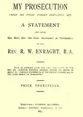 Enraght[1] believed ritualism in worship was essential for adherence to the Church of England's Catholic tradition.[2] His religious practices and publications on Catholic worship and Church-State relationship led him into conflict with church authorities and were prosecuted under the Public Worship Regulation Act.[3][4]