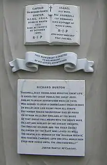 The couple are buried in a tomb in the shape of a Bedouin tent, designed by Isabel,[52] in the cemetery of St Mary Magdalen Roman Catholic Church Mortlake in southwest London. The coffins of Sir Richard and Lady Burton can be seen through a window at the rear of the tent, which can be accessed via a short fixed ladder. Next to the lady chapel in the church there is a memorial stained-glass window to Burton, also erected by Isabel; it depicts Burton as a medieval knight.[53] Burton's personal effects and a collection of paintings, photographs and objects relating to him are in the Burton Collection at Orleans House Gallery, Twickenham.[54]