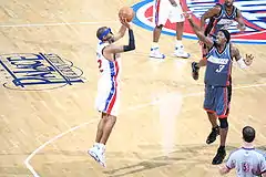 The Pistons defeated Philadelphia in the first round before holding off the young Orlando Magic led by Dwight Howard, with Hamilton scoring 32 points in the 5th game and 31 points in the 6th game, as he surpassed Isiah Thomas as the Pistons' all-time leading scorer in the playoffs.[17] Detroit advanced to their sixth straight appearance in the Eastern Conference Finals, but fell to the Boston Celtics in six games. After the loss, Joe Dumars acknowledged it was probably the end of an era, signaling the team's impending changes.[18] Indeed, changes began immediately when Flip Saunders was dismissed as head coach, despite the best winning percentage in Pistons history.