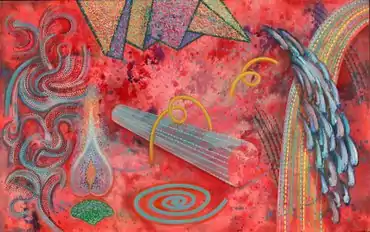 After an early-1980s trip in which Loving encountered Byzantine mosaics and frescoes, he began incorporating discrete, personalized symbols alluding to sexuality (lips, flowers, fountains, seeds, fireworks) and elemental or microcosmic life (flames, molecules, water, crystals) in his work (e.g., Amorosa Tropicalia, 1983;[50] La Source, 1986; Catalysis, 1991; or Parabola, 1993).[7][49][35][34] Critics such as Charlotte Moser wrote that these works demonstrated a romantic impulse to fix the physical properties of ephemeral sensory impressions, creating a precarious balancing act between flux and order, physics and alchemy.[7][2] Franz Schulze wrote that the symbols Introduced a surrealist quality into the work, transforming it from "a cool formalism to an ideographic fantasy, no less cool, but filled with mystery and dark ambiguities."[10]