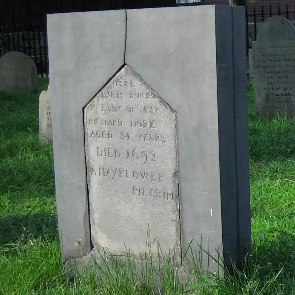According to the Mayflower Society records, he died in Salem after 19 March 1693/4, but before 20 April 1696.[69] There is documentary evidence that he was alive in 1694 and dead in 1696. His gravestone gives an age of 84, but it is more likely that Richard was unsure of his birth date. The gravestone in the old Salem burial ground gives a date of 1692. But the date, and additional words 'a Mayflower pilgrim', were added at some point between 1901 and 1919, and provoked some outraged reaction in the local press.[71]