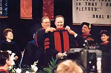 Roberts pushed the team to increase enrollment, tighten budgets and find additional revenue streams. At the same time, he used his television program to promote the University. He started the Adopt A Student scholarship campaign as one of these efforts, and embarked on other efforts to promote Christian education and increase enrollment.[32][33] Over the next four years, enrollment increased by 1,200 students and the university's debt shrank by 50 percent [34] Roberts used his ministry connections to help with recruitment, specifically in the African American community. Through his speaking at churches and conferences, he was mainly responsible for the 20% African American student body.[1] ORU receives the Racial Harmony Award from the Council for Christian Colleges and Universities in 2002.[35]