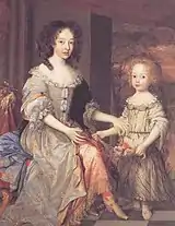 Over the next decade Talbot used his influence with James to cement his position at court: he began building links with others, like the Earl of Orrery, who were hoping to supplant the "Old Royalists" such as Ormond.[5] He remained a divisive figure at court thanks to his imposing presence, domineering manner, and "strong opinions expressed with much swearing".[5] In 1669 he married noted beauty Katherine Baynton, daughter of Colonel Matthew Baynton and Isabel Stapleton. They had two daughters, Katherine and Charlotte;[8] Baynton died in 1679.[9]