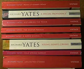 Yates's first novel, Revolutionary Road, was a finalist for the National Book Award that year (alongside Joseph Heller's Catch-22, J. D. Salinger's Franny and Zooey, and the winning novel, Walker Percy's The Moviegoer). Yates was championed by writers as diverse as Kurt Vonnegut, Dorothy Parker, William Styron, Tennessee Williams and John Cheever. Yates's brand of realism was a direct influence on writers such as Andre Dubus, Raymond Carver and Richard Ford.[1]
