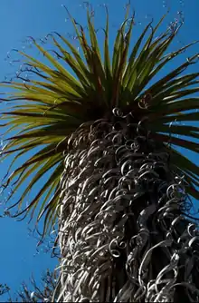 The species has strap-like leaves that taper to points and can grow up to 1 metre (3 ft 3 in) long.[2] These are dense and form from terminus branches. As the leaves age they are persistent, meaning that they remain on the plant. Young leaves are green in colour but as they age they become a greyish brown.[1] The margins of these leaves are serrated and can cut human skin.