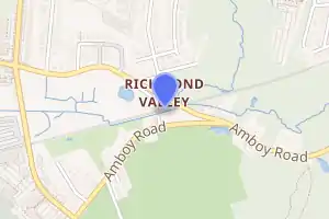 Richmond Valley is a Staten Island Railway station in the neighborhood of Richmond Valley, Staten Island, New York. Located at Richmond Valley Road and Amboy Road on the main line, the station is a mixture of open cut (below grade level) at the north end and grade level at the south end.