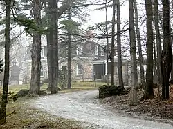 The Richwood Estate is located in southern Swanton, on the east side of US 7 about 1 mile (1.6 km) north of the border with St. Albans. It is set on 9 acres (3.6 ha) of primarily woodland, between Sugarmaple Drive and Maple Garden Estates. The main house is a 1+1⁄2-story stone and frame structure, covered by a mansarded hip roof. Its foundation and ground floor are composed of stone from Isle La Motte, with locally quarried redstone trim. The steep edges of the mansard roof are composed of purple slate from Fair Haven, and is pierced by shed-roof dormers. The south-side porch features a round corner pavilion and a porte-cochere. The building's interior features rich woodwork, and an entrance hall inlaid with three colors of native Vermont marble. Northeast of the house stands a carriage house that continues the rich exterior features of the house.[2]