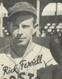 In 1934, the Red Sox signed Ferrell's brother Wes, forming a formidable battery for the next three and half seasons.[1] Rick ended the year with a .297 batting average and led the league's catchers in fielding percentage and in putouts and finished second in assists.[2] With Ferrell calling the pitches in 1935, his brother pitched to a 25–14 won–loss record,[4] and was runner-up to Hank Greenberg in voting for the 1935 American League Most Valuable Player Award.[19] Ferrell posted a .301 batting average for the year and led the league in baserunners caught stealing.[2]