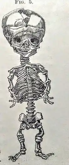 An X-ray or radiograph of an advanced sufferer from rickets tends to present in a classic way: the bowed legs (outward curve of long bone of the legs) and a deformed chest. Changes in the skull also occur causing a distinctive "square headed" appearance known as "caput quadratum".[14] These deformities persist into adult life if not treated. Long-term consequences include permanent curvatures or disfiguration of the long bones, and a curved back.[15]